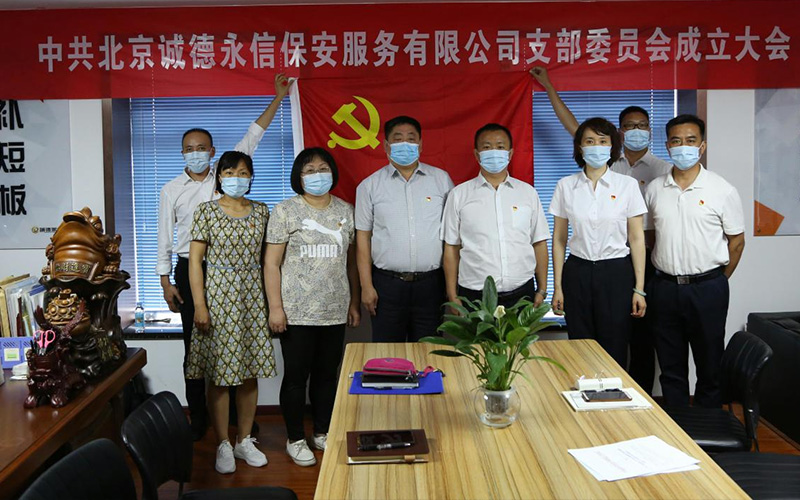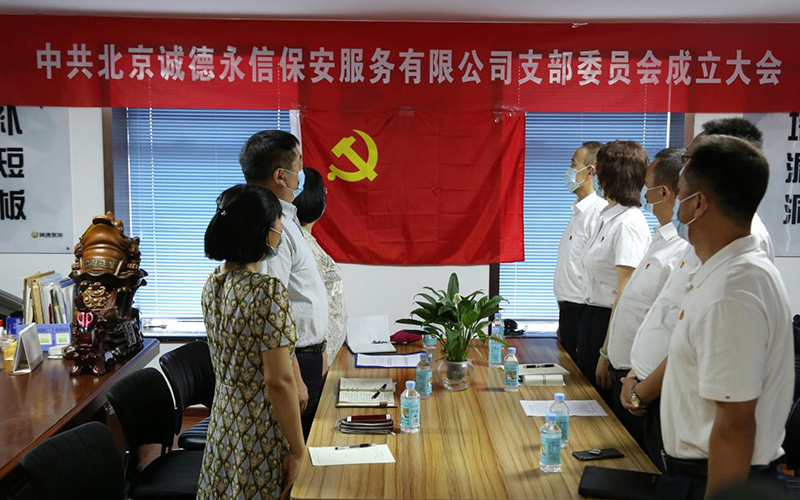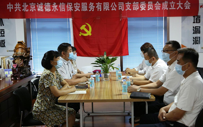 大会在激昂的国歌声中拉开序幕。国润党群服务中心党委书记陈进梅同志宣读《关于成立北京诚德永信保安服务有限公司支部委员会的批复》。在热烈而持久的掌声中,在各级领导和与会党员的共同见证下,北京诚德永信保安服务有限公司党支部正式宣告成立。
