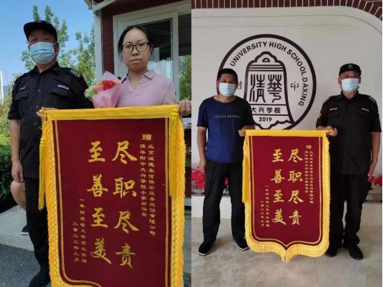 近日,大兴区新源学校一年四班母同学的家长将一面写有“尽职尽责,至善至美”的锦旗送到了新源学校门卫室。表达对学校安保工作的肯定,同时感谢北京诚德永信保安服务有限公司驻校保安员们的忠于职守和辛勤付出。近日,大兴区新源学校一年四班母同学的家长将一面写有“尽职尽责,至善至美”的锦旗送到了新源学校门卫室。表达对学校安保工作的肯定,同时感谢北京诚德永信保安服务有限公司驻校保安员们的忠于职守和辛勤付出。